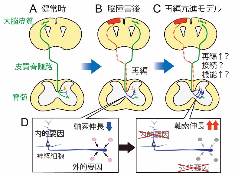 脳や脊髄の障害により神経回路が破綻すると、重篤な機能不全を引き起こします。一度障害された機能は、その後、自然回復あるいは増悪するなど変容していくことが知られますが、その要因の1つとして、障害後に残存した回路の再編が寄与することが示されてきました。
