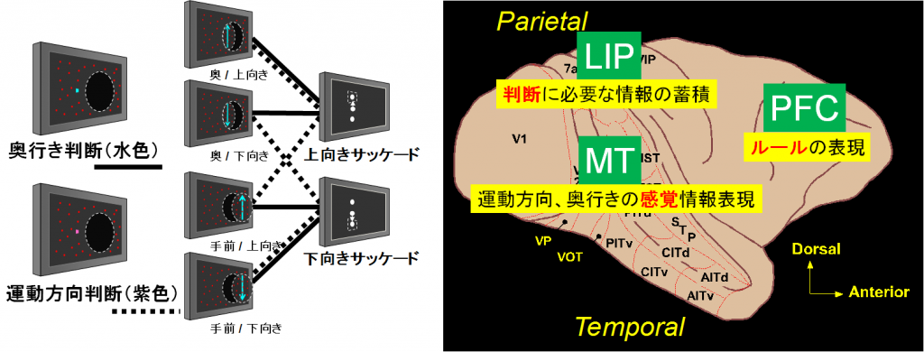 このタスクスイッチ課題には少なくとも3つの脳領域の相互作用が重要である。大脳皮質MT野は運動方向、奥行きの感覚情報表現を司り、LIP野は判断を形成するための感覚情報の蓄積を担当し、前頭前野(PFC)はどちらの課題を行うかの制御信号を生成する(図)。これまでの研究から、感覚情報表現を司るMT野の活動自体は、行う課題に依存して変化しないことがわかっている。ただし、MT野ニューロンの出力が行動特異的であることから、課題ごとに感覚ニューロンを2群準備し、ルールに依存して不要な出力を遮断していることが予想される。そのメカニズムは明らかでないが、我々は最近、LIP野ではルールによって、判断を形成するための感覚情報の蓄積スピードが異なることを発見した。すなわち、行っている課題(例えば、運動方向判断)に関連した情報(動きの方向)のみが蓄積される。これは「必要な専用回路へのシフト」の実体が、「判断形成における感覚情報蓄積過程のダイナミックなゲイン制御」であることを示唆する発見である。本研究では、本タスクスイッチ課題で重要と思われる3つの脳領域間の相互作用を解明し、適応的な神経回路シフトの実体を明らかにすることを目標とする。本研究の特徴は、ルールに依存した素早い判断の切り替え(タスクスイッチング)という霊長類に特化した高次な認知機能における脳のダイナミクスを解明する点である。また、本研究は数理モデルとの相性が良く、適応回路シフトのシステム的理解に貢献できるため、その成果は判断に障害のある人の支援にも繋がると期待される。