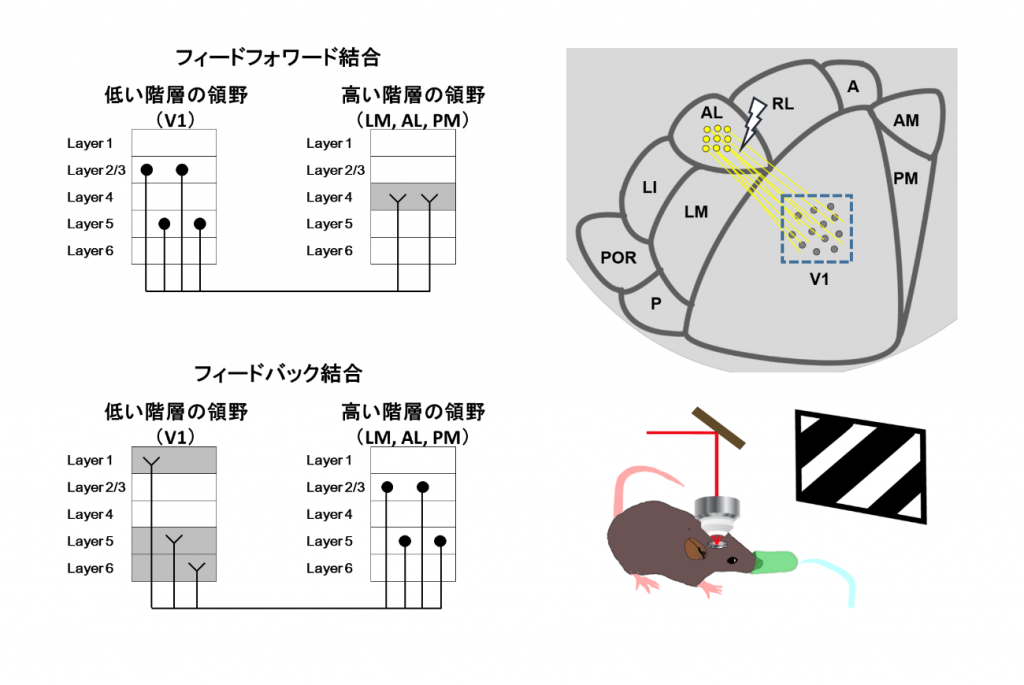 視覚野は並列階層的に構成され、低次の領野から高次の領野に向かうに従い受容野が拡大すると共に、ローカルな特徴からよりグローバルな視覚パターンの検出が行われる。この大脳皮質の階層性は主に解剖学的な結合パターンにより規定される。低次な領野から高次な領野へのフィードフォワード結合では起始細胞の細胞体が2/3層あるいは5層に存在し、軸策終末が他の領野の4層に終わるのに対して、高次な領野から低次な領野へのフィードバック結合では2/3層および5層に起始細胞の細胞体をもち、他の領野の4層を避けて1層または5-6層に軸策終末が入力する。ところが、大脳皮質の領野間におけるフィードバック結合の機能的な役割は、フィードフォワード結合に比べ、ほとんど解明されていない。