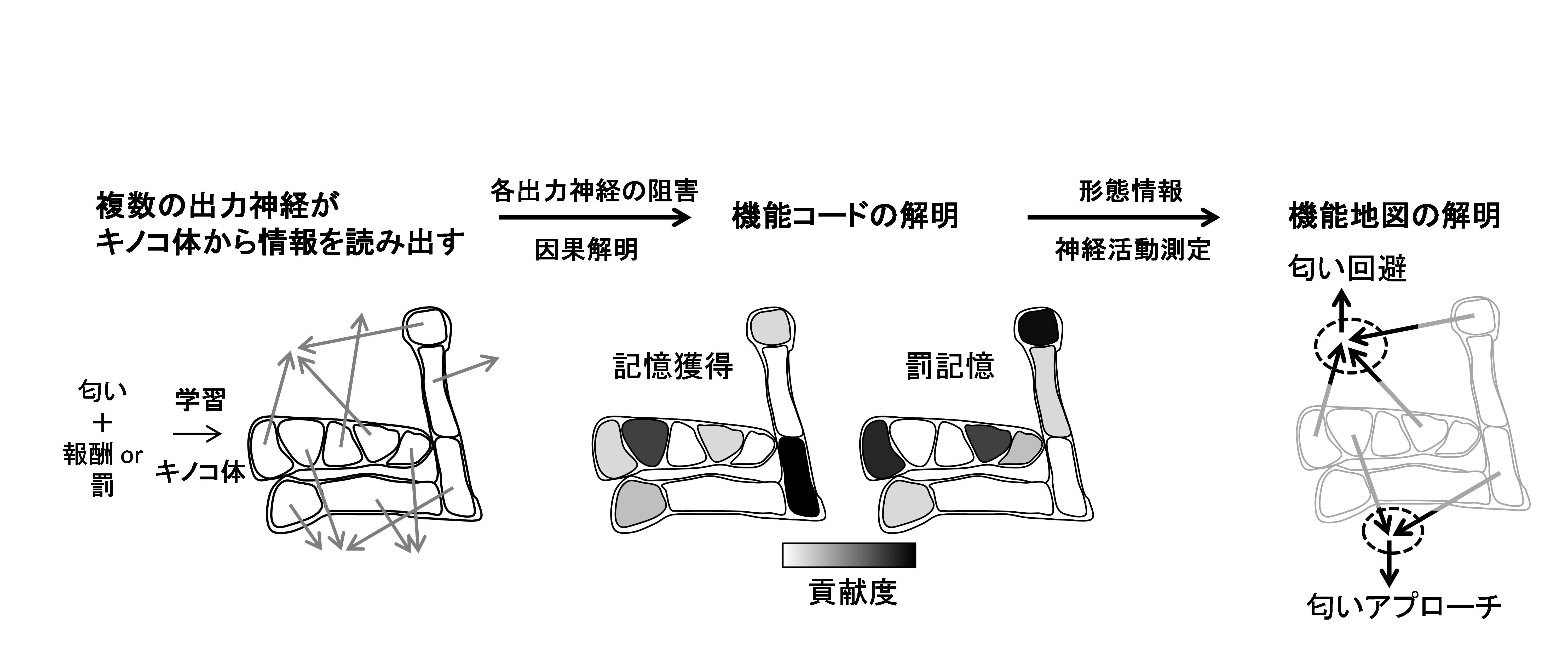 近年、我々を含む一連の研究成果により、匂い記憶の獲得・保持・読み出しの全ての過程が、ショウジョウバエ脳内のキノコ体と呼ばれる単一の脳構造で処理されることが報告された。さらにキノコ体の阻害は、匂いに対して誘引・忌避という正反対の行動をひきおこす報酬・罰記憶の両者に影響を及ぼすことが示されている。つまり、キノコ体は報酬・罰記憶の獲得・保持・読み出しという6つの過程に関わっており、単一の脳構造の多様な機能の発現と回路状態の遷移を研究する上で有用なモデルである(図参照)。