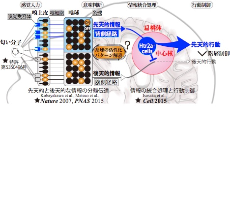 嗅覚入力による先天的と後天的な匂い情報は鼻腔内の背側と腹側のゾーンで分離して脳へ伝達される。背側ゾーンの嗅細胞を除去したマウスは、猫の匂いを感知できるし、後天的に危険を学習できるが、先天的な忌避行動を示さない(Kobayakawa et al., Nature 2007, Matsuo et al., PNAS 2015 )。分離して脳へ伝達された先天的と後天的な情報はどのように処理されるのだろうか?両者の情報は、扁桃体中心核のセロトニン2A発現細胞で統合され、先天的な恐怖が促進される一方で、後天的な恐怖が抑制されるという、先天的恐怖優先の階層性制御を受けるという予想外の事実が明らかになった(Isosaka et al., Cell 2015)。先天的と後天的な恐怖は恐怖中枢において同一の情動状態へと統合されるのではなく、拮抗的な関係にある異なる情動状態として存在することが示唆される。そうであれば、恐怖情動を真に理解するためには従来から研究されている後天的な実験系のみでは不十分で、先天的な恐怖情動を扱う新たなモデルが必要となる。このような背景で、私たちは天敵臭の化学構造を人工匂い分子ライブラリーを用いて最適化することで、極めて強力な先天的恐怖行動を誘発する活性を持つ人工匂い分子群(Thiazoline-related fear odors: tFOs)の開発に成功した。tFOsはその種類に応じて多様な行動や生理応答を誘発する活性を持つ。この特徴を活用し、本計画では、感覚系が刺激の意味を判断するメカニズム、判断に応じた適切な情動状態や行動の誘発を担う脳領域や神経細胞、先天的恐怖などの情動状態を脳が生成する原理、情動状態が脳や体に与える影響の解明などの重要な諸課題の解明を目指す。また本計画では、tFOsによる先天的恐怖情動の誘発技術に加え、全脳活性化マッピン法、多次元情動行動計測法、脳深部自由行動イメージング法などの独創的な先進技術を多様な研究者が持つ課題に適用することも目指す。