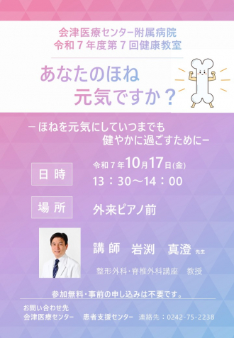 お知らせ 令和7年度第7回健康教室のお知らせ 整形外科・脊椎外科講座 岩淵真澄教授より、―ほねを元気にしていつまでも健やかに過ごすために―をテーマに講演いたします。参加無料・事前申し込み不要となっていますので、是非ご参加下さい。