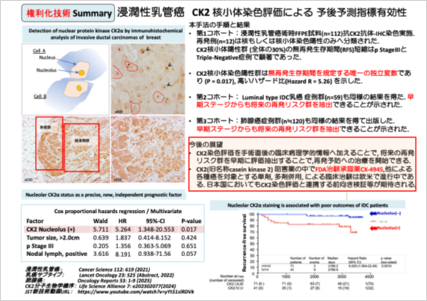 私たちは複数の固形癌を対象に、癌の早期ステージからも将来の再発リスクを予測する癌予後マーカー見出しました。それを基盤として、予後予測診断技術の社会実装を目標に開発を進めています。 対象とする分子CK2はリン酸化酵素として増殖関連酵素の一つですが、私たちは乳癌術時試料を用いた組織化学的手法による染色評価から、核の中の「核小体」におけるCK2分子集積 (核小体CK2染色陽性群)は将来の再発と関連することを初めて見出しました。様々な臨床データと照合する統計解析の結果、核小体CK2染色陽性は予後について最も寄与率が高いマーカーであり、統計学的にも「将来の無再発生存期間を規定する独立変数である」事を明らかにしました。10年フォローしたコホート解析の結果、それらの核小体陽性群は陰性群と比較し時間経過とともに再発しやすいグループであることが示されました。癌手術時の検体もしくはそれ以前に診断用として癌部から取出す小さな針生検体を調べることで、再発するまで待つ事なく、再発リスクある方を早期に見出すことができると期待されます。また近年の解析から、核小体CK2染色評価手法は、治療薬剤への抵抗性ある集団をあらかじめ予測可能なマーカーとしての有効性も示唆されました。