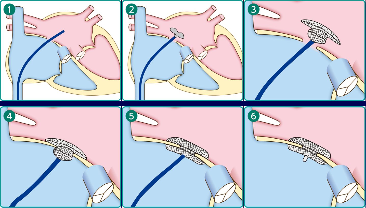 この治療法は、通常のカテーテル検査と同様の方法で行われます。閉鎖栓が心臓の目的の部位にきちんと留置できているかどうかを確認するため、経食道心エコーを使用しながら行います。このため、全身麻酔下で人工呼吸器を用いて呼吸管理を行います。2017年10月より当院手術室にてハイブリット手術室が稼働し、全身麻酔によるカテーテルを使用した治療が手術室にて施行できるようになりました。