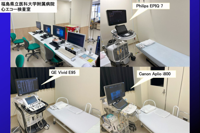 当院生理検査室では、4機種がフル稼働し、心エコー室スタッフ3~4名が常時心エコー室にての体表面心エコー検査を行える体制となっており、他科からの心エコーのオーダーも対応可能とし、オープン化して検査を行っています。従来の壁厚や心腔の計測、壁運動の評価、拡張能の評価に加え、症例に合わせて弁膜症の定量的評価や負荷エコー検査、また右心系の評価やストレイン解析、コントラスト心エコーなども施行しています。循環器内科の病棟、救急外来、救急救命センターなどではドクターが自ら心エコーを行っており、治療方針の決定に重要な位置を占めております。
