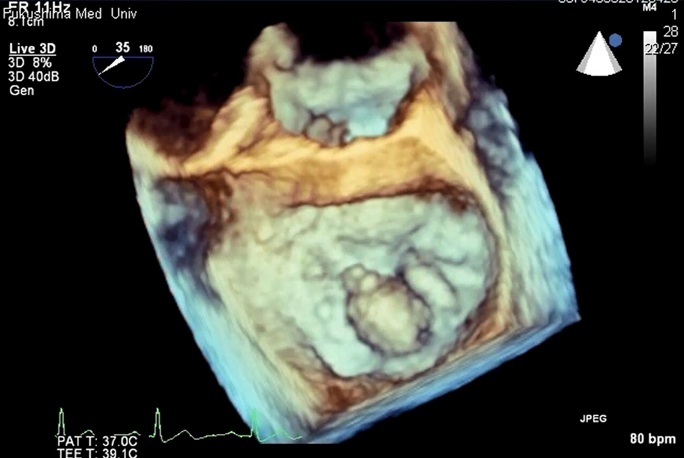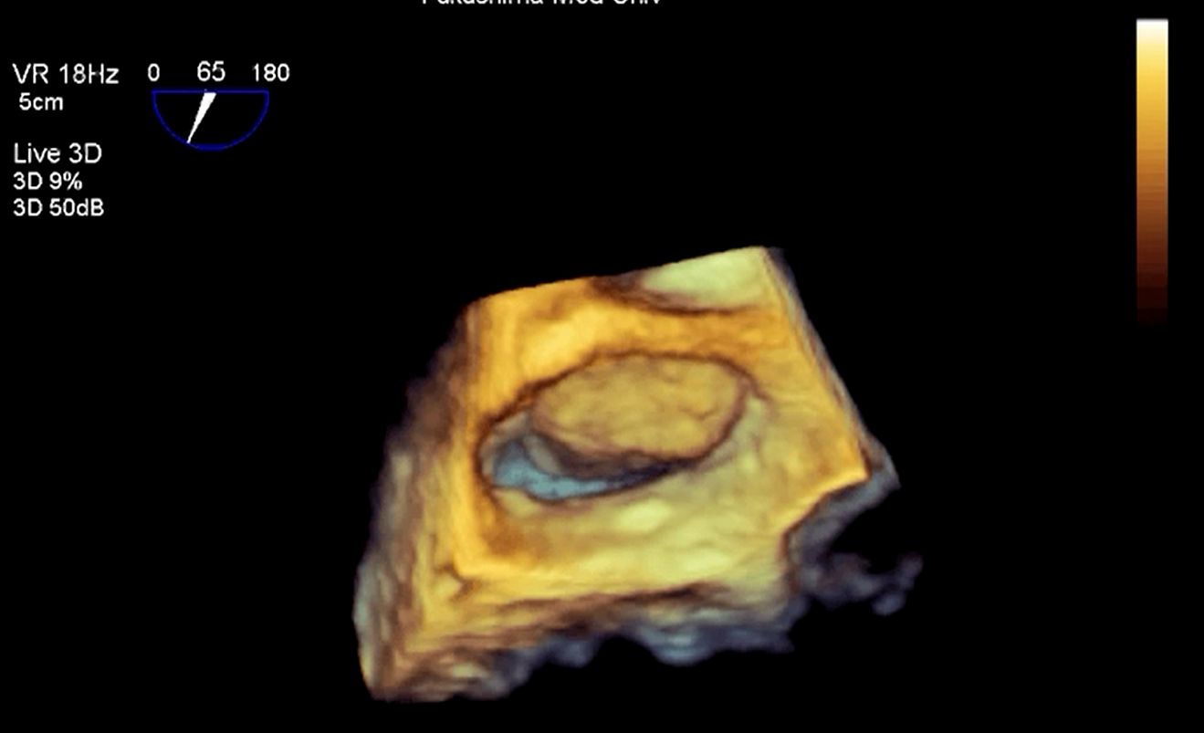 経食道心エコーは、超音波探触子を食道内に挿入して心臓を観察する検査で、体表面では評価困難な弁の性状や左房内の血栓などをより鮮明に評価が可能です。当科では、毎週2回(水、木)施行しております。当院エコー室で使用している、経食道エコーの探触子は3Dエコーの表示が可能で、より詳細に弁や欠損孔等の観察が可能です。