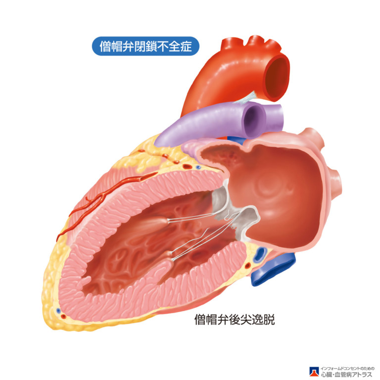 心臓弁膜症の一つに僧帽弁閉鎖不全症があります。これは、左心房と左心室の間にある僧帽弁の閉まりが悪くなる病気で、僧帽弁逆流により息切れなどの心不全症状や不整脈、心機能の低下を生じます。僧帽弁は2枚の弁尖で構成されており、ヒモ状の腱(腱索)によって左心室(乳頭筋)から引っ張られていますが、組織変性などによりこれらの構造が壊れてしまうことなどで弁閉鎖不全が起こります(図4)。