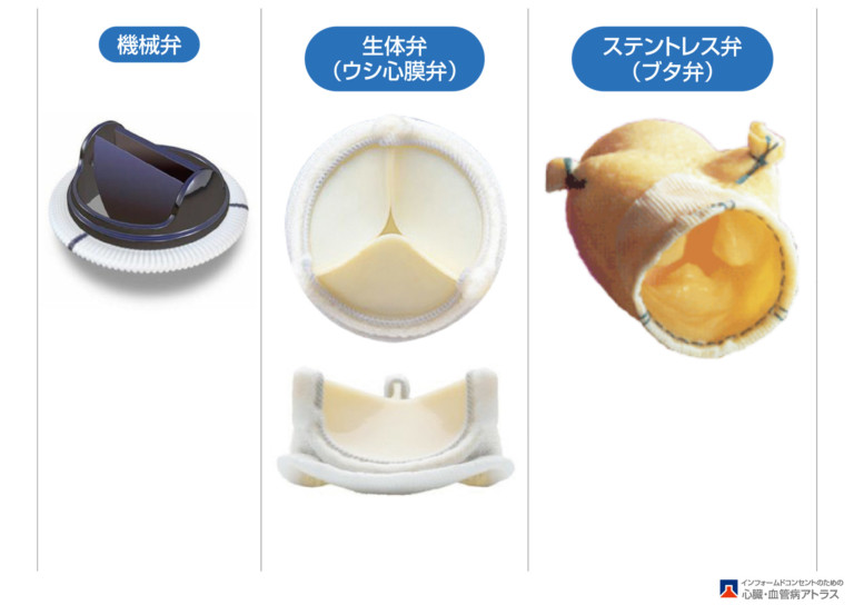 人工弁には生体弁(ウシの心膜やブタの大動脈弁を用いた生体由来の人工弁)とカーボンなどの金属からできた機械弁があり、各々以下のような特徴があります(図3)。