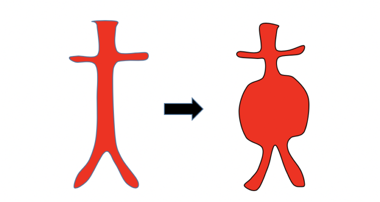 腹部大動脈瘤は腹部大動脈という比較的大きな血管(木で言えば幹のようなものですね)が膨らんでできた瘤(コブ)です。イメージとしてはこんな感じです(腹部の動脈を抜き出して描いています)。高さで言えば、おへその高さくらいです。