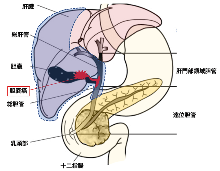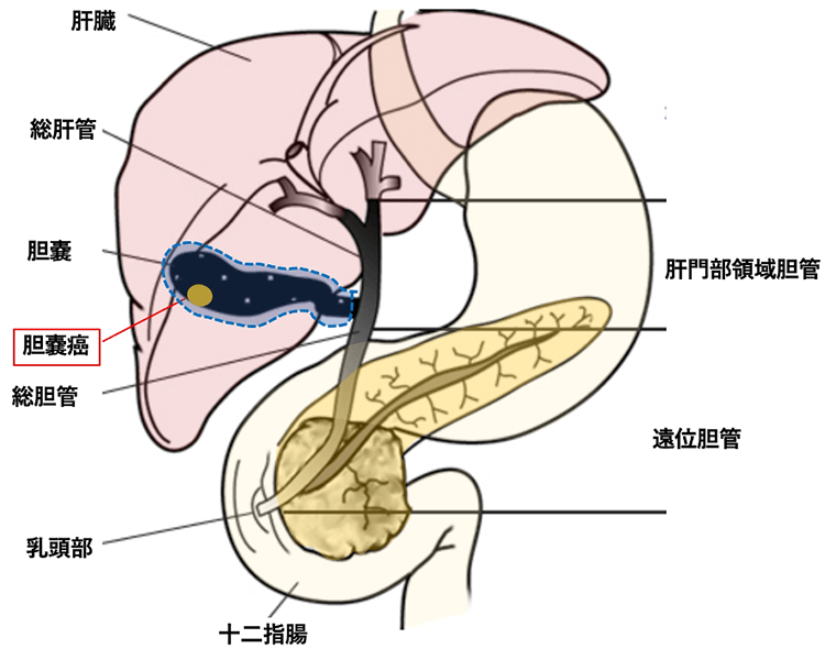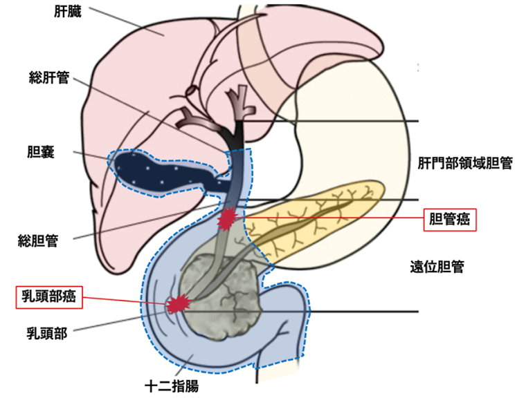 肝臓で作られた胆汁の通り道のことを胆道といいます。これには胆管、胆嚢、十二指腸乳頭部が含まれ、ここに発生した悪性腫瘍が胆道がんです。日本のがん統計では、胆道がんは年間2万人以上が新たに診断され、約17000人が死亡しております。全がん腫の部位別死亡数では男性・女性ともに8位であり、決して珍しいがんではありません1)。70歳代、80歳代の高齢者に多く、胆管がんと乳頭部がんは男性、胆のうがんは女性に多い傾向がみられます。最近では印刷業で使用される化学物質(ジクロロメタン、ジクロロプロパン)との関連が報告されています。胆道がんは、発生した部位によって胆管がん、胆嚢がん、乳頭部がんに分けることができます。