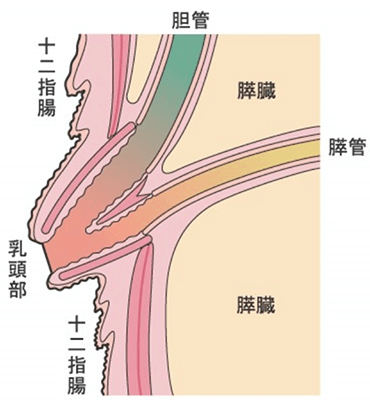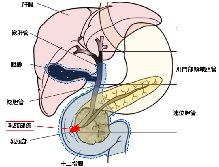 十二指腸乳頭部とは胆汁の通り道である胆管と膵液の通り道である膵管が合流し十二指腸に開口する場所です。乳頭部がんはこの膵管と胆管の合流部である乳頭部に発生する悪性腫瘍です。比較的症状(黄疸、膵炎による腹痛など)が出やすいために、胆管がんや胆嚢がんと比較すると早期に発見されるという特徴があります。乳頭部がんに対する標準的治療は手術による切除です。手術術式としては、膵頭十二指腸切除術が標準的で、十二指腸、膵臓の頭部、下部胆管、胆のうを切除します。残った胆管は小腸に、膵臓は小腸や胃などに吻合します。乳頭部がんは、膵臓、胆道領域のがんの中では比較的予後良好ながんですが、がんの進展度により予後は著しく異なります。がんが膵臓の実質まで浸潤している場合は膵臓がんと同様で予後不良とされています。またリンパ節転移陽性、神経への浸潤、血管・リンパ管への浸潤なども予後不良の因子として報告されています。外科的治療が行われた後、病理組織検査にてこれらの予後不良因子を認める場合は慎重な経過観察が必要となります。
