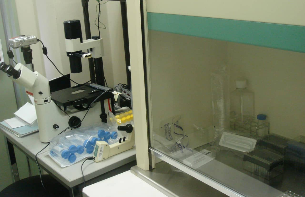 培養室は特定の細胞を培養しているので、外部から雑菌、ウイルスを持ち込まないように他の実験環境とは分けられています。手前に写っている作業台はクリーンベンチと呼ばれるものです。内部から外部に向かってフィルターを通過した風が吹き出していて、クリーンベンチ内を無菌に保つ仕組みになっています。奥に写っているのは、倒立型の培養顕微鏡です。顕微鏡は細胞培養研究には必須アイテムで、培養中の細胞の様子を日々確認します。現在、私たちの講座が保有している培養細胞は、マウス神経芽細胞腫(Neuro-2a)、マウス心筋細胞、初代培養細胞株のマウス大脳皮質細胞、マウス海馬細胞、マウス線条体細胞です。(画像をクリックすると拡大画像が表示されます)