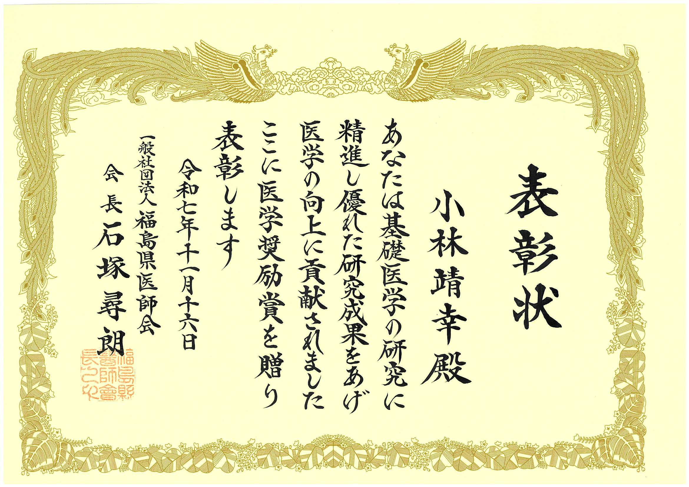 小林 靖幸 先生が福島県医師会より医学奨励賞を授与されました。