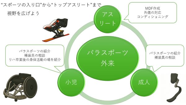 パラスポーツ外来では、障がいのある方が安心してスポーツを始め、継続できるよう「スポーツ導入支援」を中心に行います。身体機能や健康状態、生活背景、興味に合わせて、競技の紹介、目標設定、基礎体力づくり、トレーニングメニューの提案、セルフコンディショニング(ウォームアップ・クールダウン、予防プログラム立案、セルフケア)の指導を実施します。