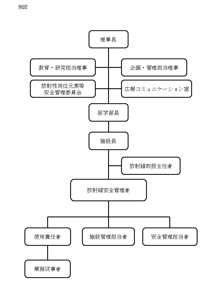 第6条 放射性同位元素研究施設における放射性同位元素等の取扱いに従事する者並びに安全管理に従事する者に関する組織は、別図のとおりとし、その職務は、本規程に定めるほか、「公立大学法人福島県立医科大学医学部附属放射性同位元素研究施設運用細則」平成18年4月1日細則第1号、(以下「細則」という。)に定める。