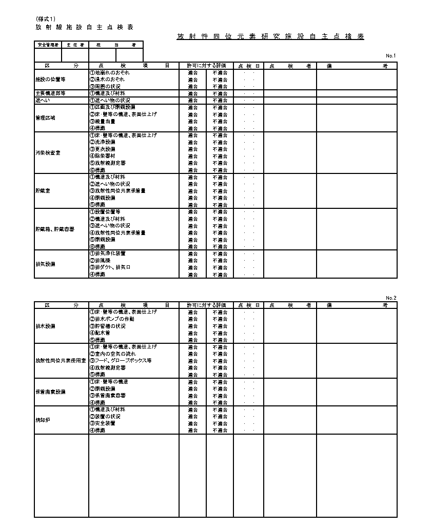第36条 施設が所在する同一市区町村内で大規模自然災害(震度5強以上の地震、風水害による家屋全壊(住家流出又は1階天井までの浸水、台風及び竜巻等による家屋全壊が発生した場合))、又は放射線施設に火災等の災害が発生した場合には、安全管理担当者及び施設管理担当者が様式1の点検表により放射線施設の点検を行い、安全管理者に報告しなければならない。