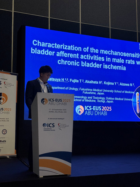 さらに、現地では著名な先生方のご発表を直接拝聴し、また他大学の先生方とも交流を深めることができ、大変有意義な経験となりました。今回の受賞を励みに、今後も下部尿路機能研究のさらなる発展に貢献できるよう努めてまいります。本発表に際し多大なるご指導とご支援を賜りました相澤直樹先生、また小島教授をはじめ医局員の皆様に、心より御礼申し上げます。