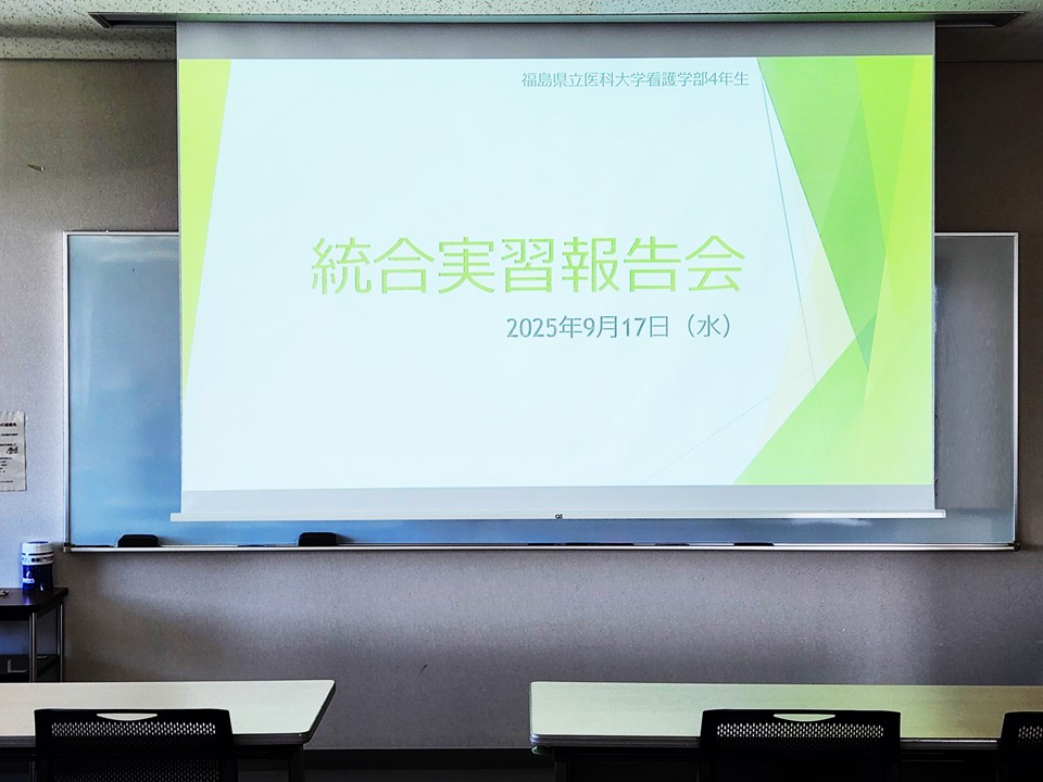 9月18日(水)、看護学部4年生による2025年度統合実習報告会を開催しました。統合実習は、基礎・母性・小児・成人・精神・老年・地域公衆衛生の7領域から学生が関心のある分野を選択し、3週間にわたり自身の課題達成に向けて取り組む実習です。