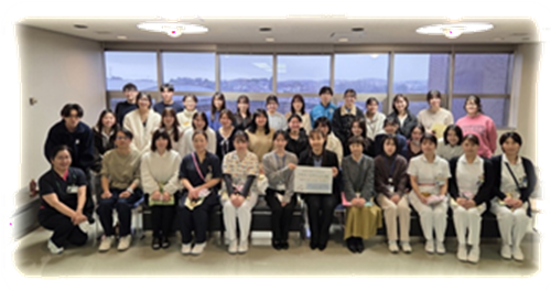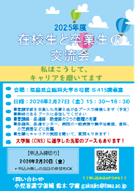 令和8年2月27日(金)に、在校生と卒業生の交流会を開催しました。今回の企画は、在校生が卒後数年程度の卒業生との交流を通して、在校生のキャリア形成を支援することを目的としました。参加者は、在校生27名(1年生4名、2年生7名、3年生15名、4年生1名)、卒業生7名(一般病棟、小児病棟、集中治療室の看護師4名、福島県・福島市保健師各1名、大学院博士前期課程CNSコース修了生1名)で、カンファレンスルームに分かれて交流を深めました。