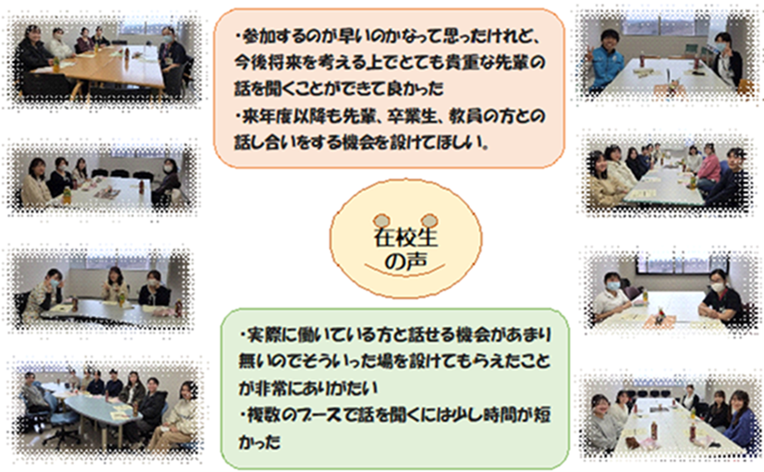 在学生は自分が希望する分野のブースへ行き、穏やかな雰囲気の中、卒業生と談笑していたり、仕事の状況等について真剣な表情で聞く様子もありました。アンケートの内容には「進路の実際を聞くことができて本当に良かった」と満足した内容や「もう少し他の先輩のお話も聞きたかった」などの感想をいただきました。「久しぶりに大学に来れて懐かしい」とエレベーターホールを見回したり、「まだ、業務が残っているので、帰ります」と白衣姿で颯爽と病棟に戻る卒業生の後ろ姿が頼もしく見えました。