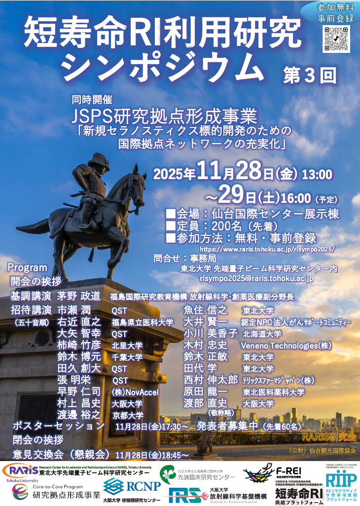東北大学先端量子ビーム科学研究センター、大阪大学放射線科学基盤機構、核物理研究センター、福島県立医科大学ふくしま国際医療科学センター先端臨床研究センターの共催で「第3回 短寿命RI利用研究シンポジウム」を開催いたします。