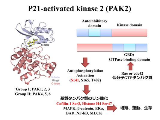 PAKsは、低分子量GTP結合タンパク質であるCdc42やRacにより活性化される一群のキナーゼ(ファミリー)で、細胞増殖、細胞運動、細胞骨格形成、生存など、細胞の基本的な機能制御に関与します。