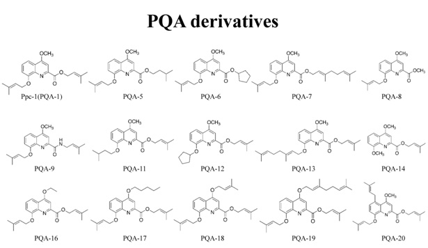 PQA誘導体については、これまでに14種を化学合成した(Kikuchi H, et al, 2015)(下図)。現在、種々のバイオアッセイ系を用いて各化合物の生物活性を評価している。