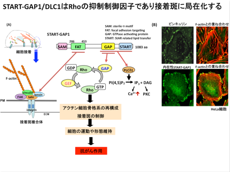 in Liver Cancer)1という名前をつけました。今では、肝臓がんばかりでなく、大腸がん、乳がん、前立腺がんなど多くの腫瘍でDLC1やその相同遺伝子であるDLC2やDLC3の欠損や発現抑制がみられ、特にDLC1は腫瘍マーカーのひとつとして認知されつつあります。私たちはSTART-GAP/DLCが細胞の形態や運動性に重要な影響を与えることに焦点をあて、その抗がん作用を明らかにしようと考えています。私たちはSTART-GAP1/DLC1が細胞の形態維持や運動性に重要な接着斑とよばれる領域に局在化することを見つけました。その局在化の分子機構を明らかにする過程で、テンシンやビンキュリンなど他の接着斑構成タンパク質と相互作用する部位を決めることができました。がんの症状が重くなるのには、細胞の異常増殖だけでなく、変形して病巣に浸潤したり、運動によって転移したりすることが必要で、その際、接着斑形成の異常も起こっているものと思われます。つまり、前述のがんの診断ばかりでなく、がん細胞の形態や運動を制御する因子を開発するという視点からもSTART-GAP/DLCの研究を進める必要があります。