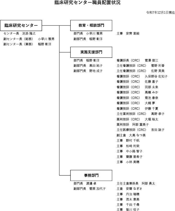 当センターでは、臨床研究コーディネーター(CRC)、薬剤師、看護師、治験事務職員などが業務に従事しており、患者さん・医師・治験依頼者の架け橋として治験全般をサポートし、患者さんに安心して治験に参加していただける環境を整えております。