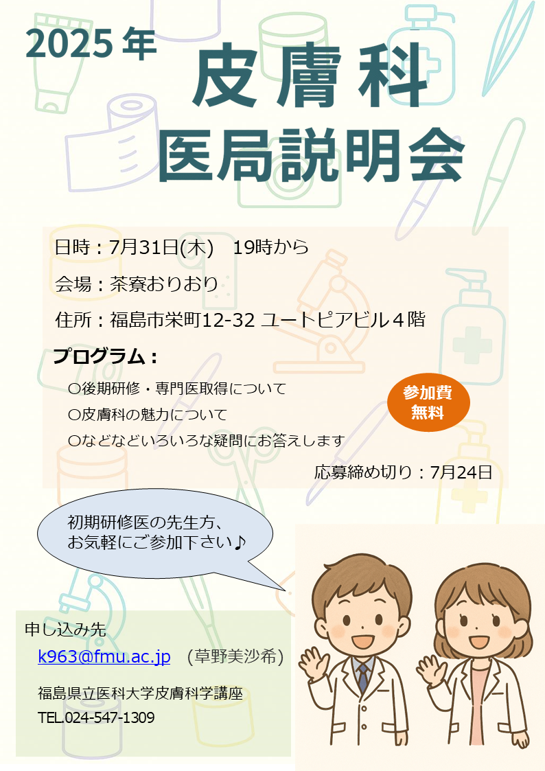 教室の雰囲気、専門医研修の実情、皮膚科の魅力など、この時しか聞けない話を聞きに来ませんか。臨床研修医の先生だけでなく、休職中の先生や他科在籍の先生、医学生の方も歓迎いたします。仕事や学業で遅れるような場合でも、お気軽に途中からご参加ください。途中までのご参加も問題ありません。