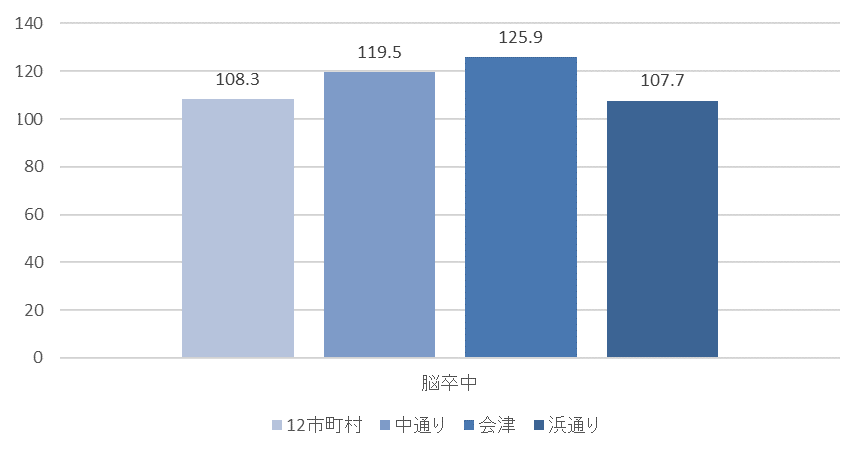 各地域における人口10万人あたりの年齢調整脳卒中発症率は、避難区域等12市町村が108.3、中通りが119.5、会津が125.9、浜通りが107.7であった(図35)。