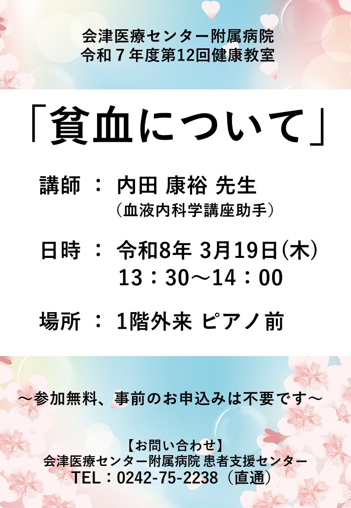 令和7年度 第12回 健康教室のお知らせ2026.03.042026年3月4日 令和8年3月19日(木)に健康教室を開催いたします。 今回は「貧血」について、血液内科の内田康裕先生が講演いたします。 興味のある方はぜひご参加下さい。