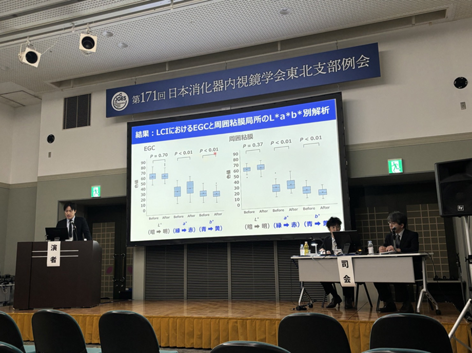 加藤は,両学会の支部評議員として参加し,消化器内視鏡学会のシンポジウム1「消化管腫瘍性病変に対する内視鏡診療 ~診断・治療の工夫とリスクマネージメント~」において,「l-menthol 散布による早期胃癌の明瞭効果 ~LCI を中心とした色差での検討~」を発表したほか,同学会の一般演題「胃3」で座長を務めました。