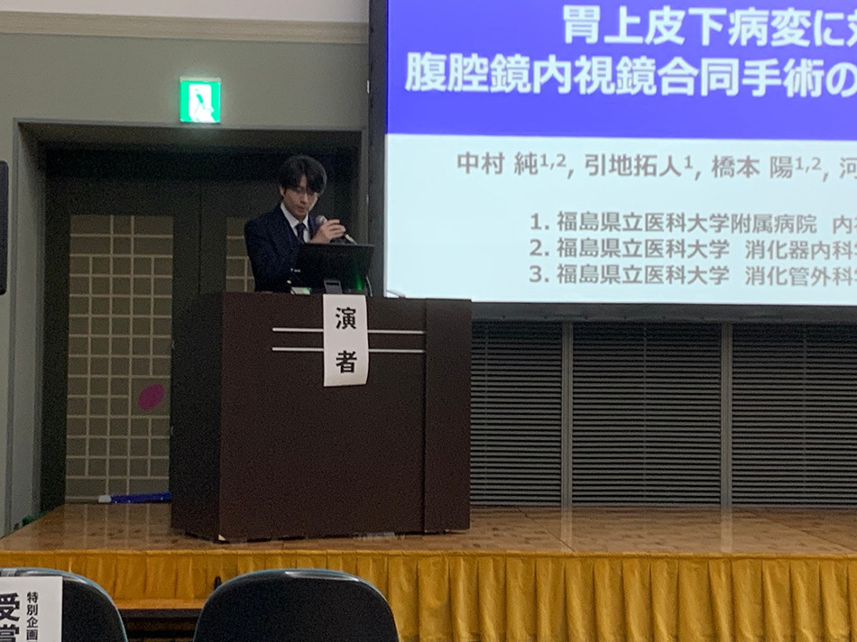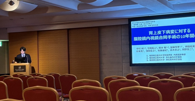 中村は,両学会の支部評議員として参加し,消化器病学会のシンポジウム1「消化器がんに対する診断、治療の最前線」で「胃上皮下病変に対する腹腔鏡内視鏡合同手術の 10 年間の検討」を発表しました。また,消化器内視鏡学会の一般演題「小腸その他」で座長を務めました。