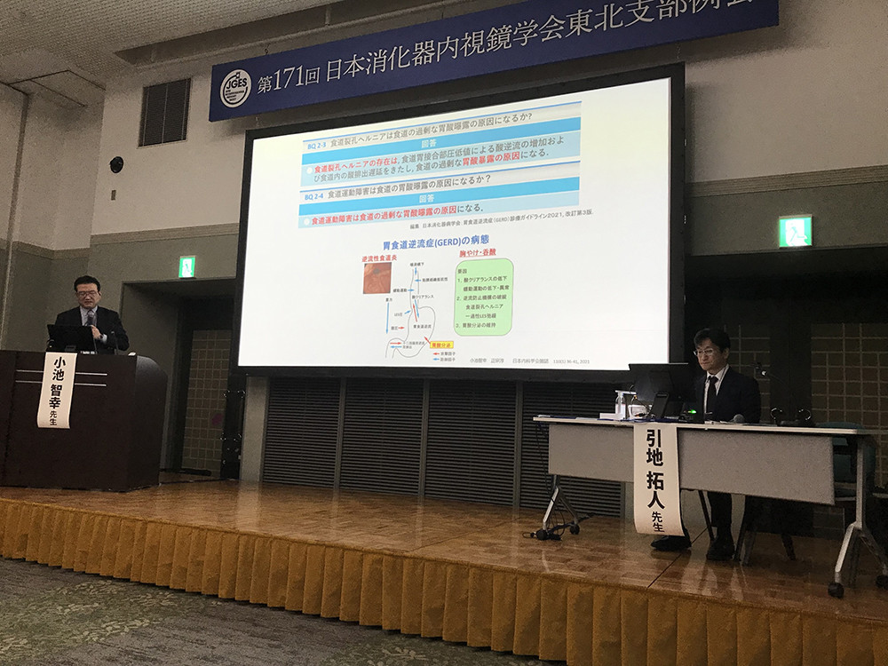 2024年2月2日(金)に第171回日本消化器内視鏡学会東北支部例会,2月3日(土)に日本消化器病学会東北支部 第216回例会が仙台市のフォレスト仙台で開催されました。内視鏡診療部から,部長の引地拓人(病院教授),副部長の中村純(学内講師),橋本陽(助教),加藤恒孝(助手),栁田拓実(助手)が演者,司会・座長として参加しました。