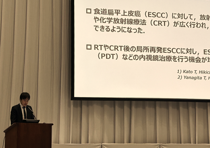 加藤は,日本消化管学会総会学術集会のコアシンポジウム「消化管腫瘍学の新展開」の「消化管腫瘍に対する内視鏡治療を併用した集学的治療」において,「放射線療法/化学放射線療法後の局所遺残・再発食道扁平上皮癌に対する内視鏡治療」を発表しました.