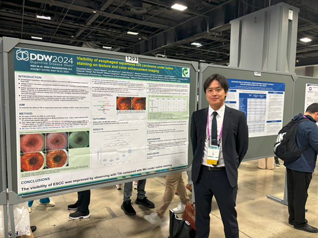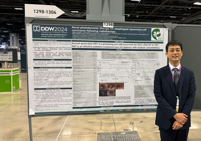 引地は,消化器内視鏡学会,消化器病学会のデジタルポスターセッションの座長を務めました.中村は消化器内視鏡学会のデジタルポスターセッションで,「消化器内視鏡診療における鎮静体制の改善と教育」を発表しました. 根本は,竹田綜合病院の共同演者として参加しました.加藤はWS4門脈圧亢進症治療最前線で,「食道静脈瘤に対するTXI観察下のゲル充満下内視鏡的硬化療法」を発表しました.栁田は消化器内視鏡学会のデジタルポスターセッションで,「放射線療法後の再発食道扁平上皮癌に対する光線力学的療法の現状と工夫点」を発表しました.