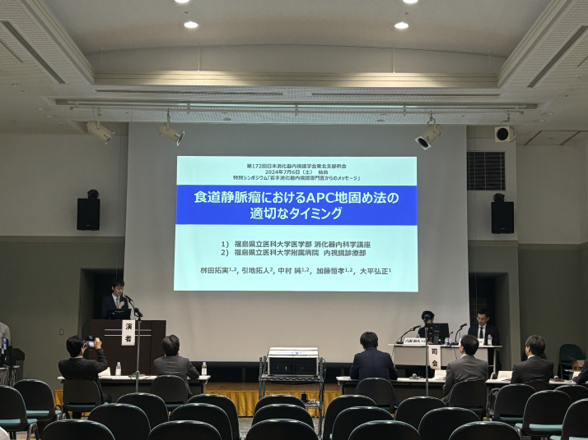 中村は一般演題「治療②」にて「小児の食道静脈瘤に対する内視鏡治療の現状」,加藤はシンポジウム「Splanchnic caput Medusaeと門脈圧亢進症治療戦略」にて「食道静脈瘤に対するTXI観察下のゲル充満下内視鏡的硬化療法」,栁田はパネルディスカッション「Splanchnic caput Medusaeからみた異所性静脈瘤の病態・診断・治療」にて「十二指腸静脈瘤に対するシアノアクリレート系組織接着剤注入を中心とした内視鏡治療」を口演しました.