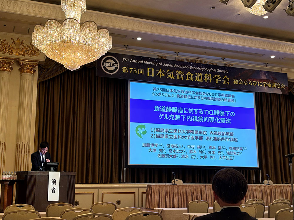 引地は,一般演題のポスターセッション「気管・その他」で座長を担当し,加藤はシンポジウム2「食道疾患に対する内視鏡診療の新展開」において「食道静脈瘤に対するTXI観察下のゲル充満下内視鏡的硬化療法」を発表しました.