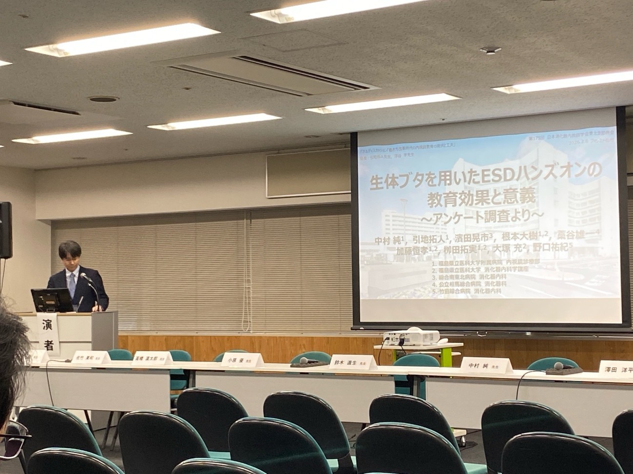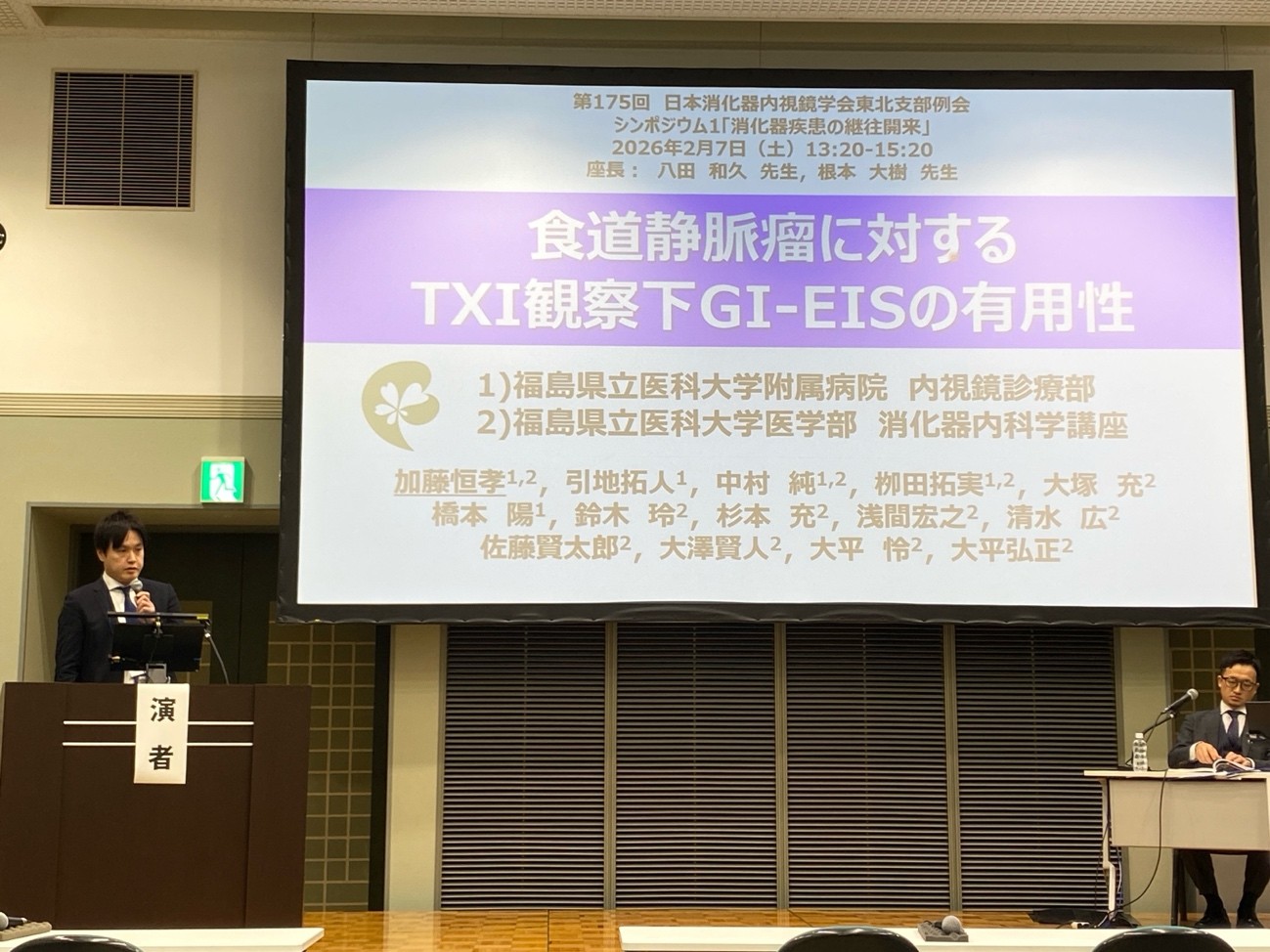 内視鏡診療部から,部長の引地拓人(病院教授),副部長の中村純(学内講師),根本大樹(助教),加藤恒孝(助教),栁田拓実(助手)が演者,司会・座長として参加しました.引地は,消化器内視鏡学会東北支部の幹事ならびに両学会の支部評議員,中村,根本,加藤,栁田は両学会の支部評議員としても参加しました.