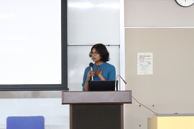 アベイシンゲ博士からは、災害研究の倫理を研究者がどのように定義しているかについて文献レビューとインタビューをもとに行った考察についての発表がありました。東日本大震災後の研究を行う上での倫理的課題についても知見の共有があり、その中には、弱者を定義する事の難しさや、繰り返しの研究参加に対する参加者の疲労などが含まれました。