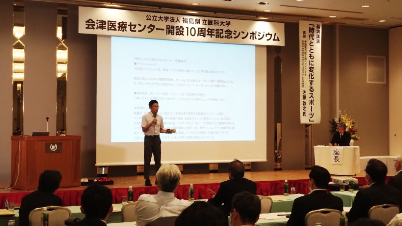 基調講演では、中国電力ヘッドコーチの佐藤敦之氏(2008年北京オリンピックマラソンオリンピック代表、会津若松市出身)から、マラソンシューズの進化による競技へのアプローチやデータによる健康管理についてお話しいただきました。