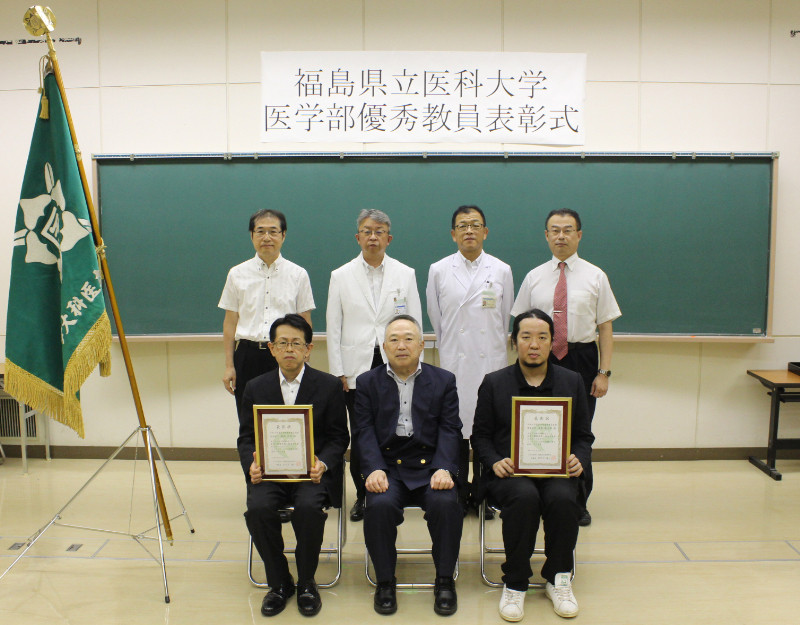 表彰式には竹之下誠一理事長兼学長をはじめ、鈴木弘行教育・研究担当理事、藤森敬也医学部長、小島祥敬教育評価委員長、福島哲仁教育評価副委員長が出席し、受賞者に表彰状と楯が授与されました。また、竹之下誠一理事長兼学長から受賞者へ「今後も、引き続き医学教育へ弛まぬ熱意を注ぎ、福島の地に根ざす大学としてそれらの成果をあまねく地域に還元し、福島の未来の創造と発展、県民の健康を支えるべく活躍して欲しい」と期待を述べました。