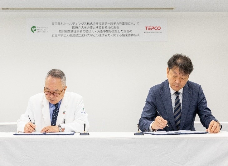 令和6年7月4日、公立大学法人福島県立医科大学と東京電力ホールディングス株式会社(以下、東京電力HD)は、福島県地域防災計画原子力災害対策編及び福島県原子力災害医療行動計画を実効性あるものにするために、福島第一原子力発電所の構内において医療介入を必要とするおそれのある放射線業務従事者の被ばく・汚染事象が発生した場合の連携協力に関して協定書を締結しました。