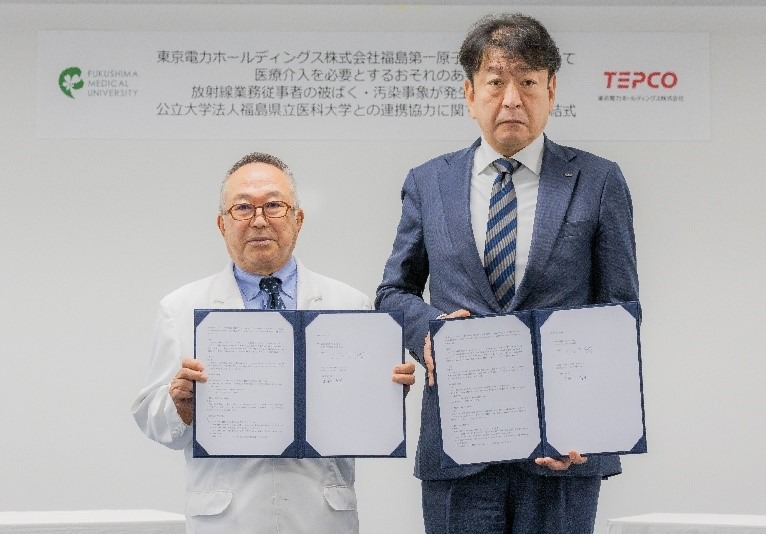 協定式では、東京電力HD小早川智明代表執行役社長から「医療介入を必要とするおそれのある被ばく・汚染事案に対して、これまで以上に円滑な連携対応が実施できるようになる」と挨拶があり、竹之下誠一理事長兼学長は「廃炉作業に従事される方を 健康面から支えるとともに、ひいては廃炉作業全体の安全な推進に寄与することになり、他の地域の 原子力事業所と原子力災害医療に携わる医療機関にとっても先行モデルとなる」と協定締結の意義を述べました。
