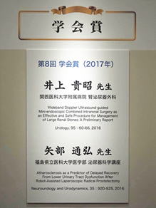 【 賞について 】 日本泌尿器内視鏡学会では、前年に発表された泌尿器内視鏡に関する論文において、特に素晴らしい論文に対して学会賞を授与してきました。今回、本論文が第8回日本泌尿器内視鏡学会学会賞に選ばれ、第31回日本泌尿器内視鏡学会総会において表彰されました。