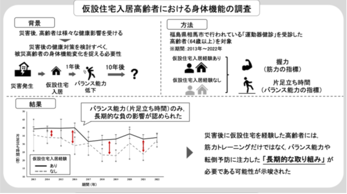 結論として、震災後に仮設住宅に入居した避難者では、筋力低下への長期的影響は限定的であった一方で、震災後10年間にわたりバランス能力への影響が見られました。