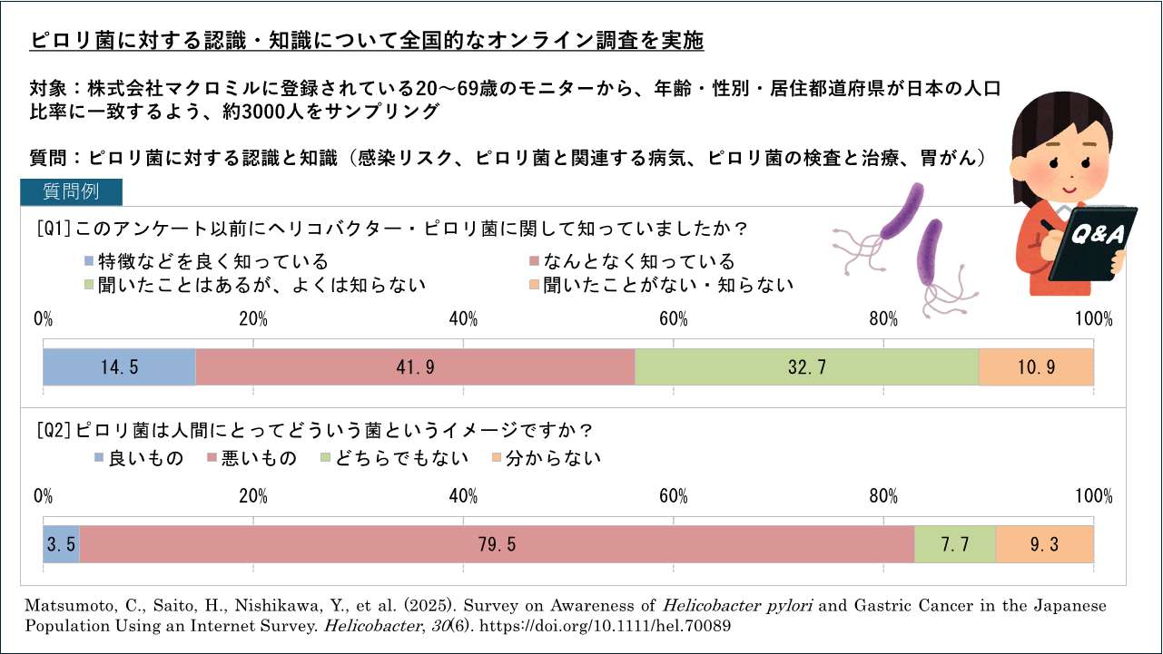 日本人のピロリ菌および胃がんに関する認識を評価し、ピロリ菌知識の高さに関連する要因を調べるため、2024 年3 月14 日から同年3 月16 日の間に、株式会社マクロミル登録モニターを対象として、全国的なオンライン調査を実施しました。