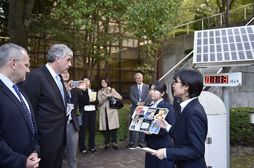 その後、医学部3年生 木下 瑠菜さん、年名 悠さん、楯 和馬さんによるキャンパスツアーに参加。3.11時の本学の対応や、線量の変化、除染活動等につき説明を受けたほか、放射線災害医療センターでは、放射線災害医療学講座の長谷川有史教授による、汚染のある傷病者受け入れのトレーニングを見学しました。